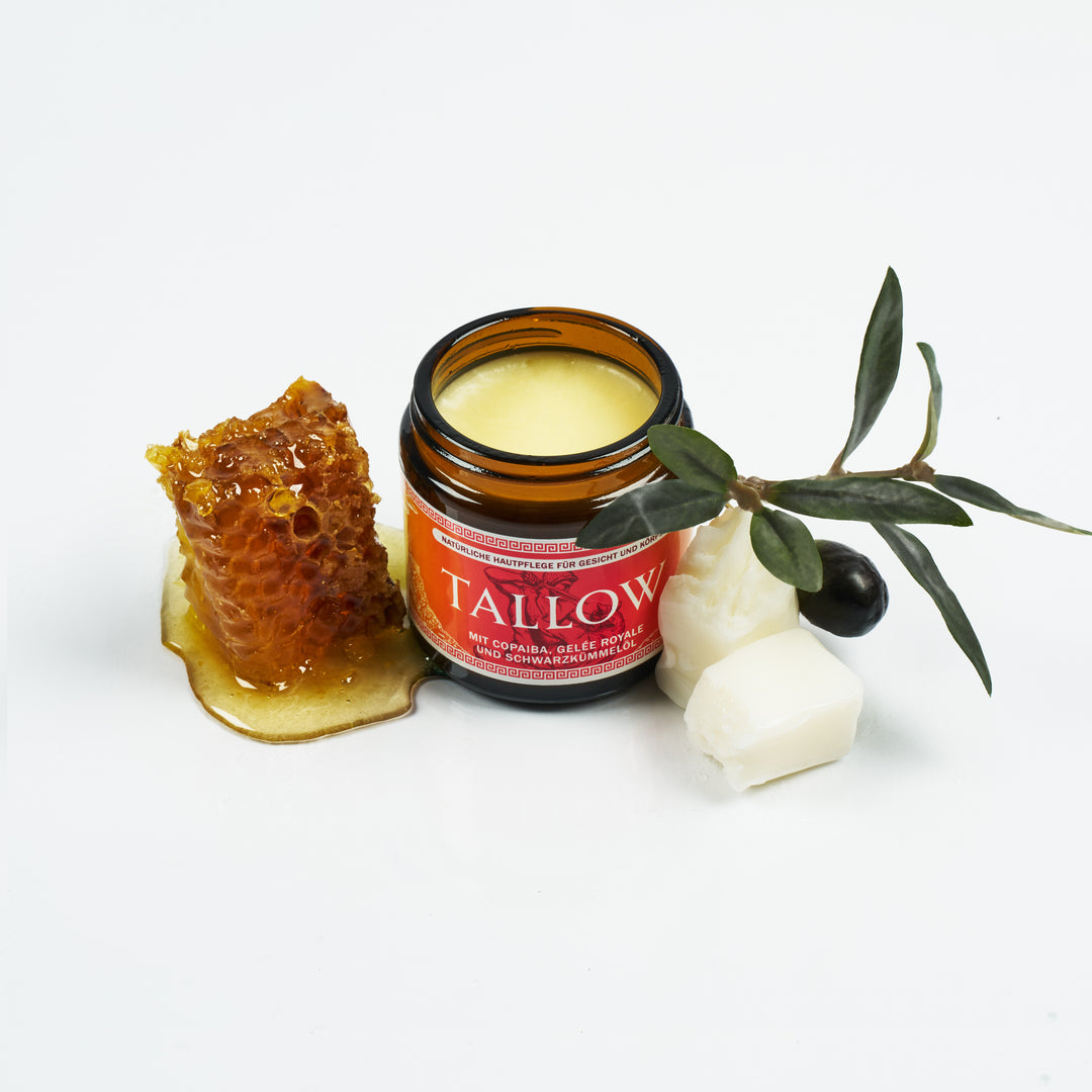 Rindertalg aus Weidehaltung ähnelt unserem natürlichen Hautsebum, ist reich an Vitamin A, D, E und K und stärkt sanft die natürliche Hautbarriere. Er fördert die Kollagenbildung und reduziert Falten sichtbar.